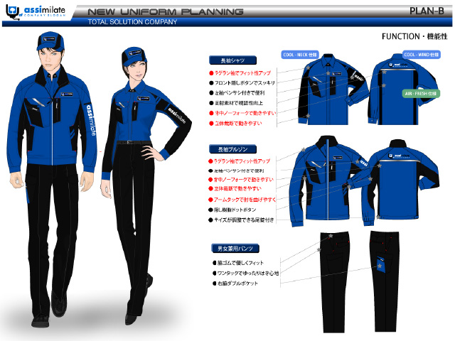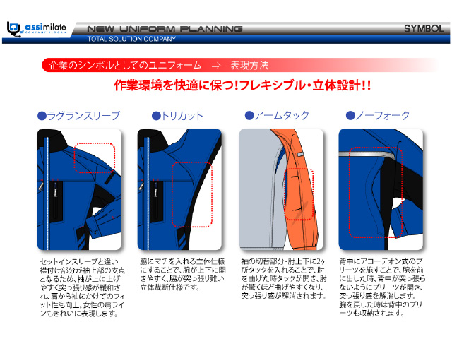 また、作業に必要な機能性や着用環境を向上させる機能素材を効果的に組み合わせ、ブランディング・ユニフォームとしてご提案いたします。